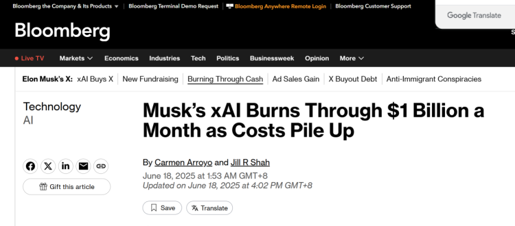 【环球网科技综合报道】6月19日消息,据彭博社报道,马斯克旗下人工智能企业xAI因开发Grok等先进AI模型,在服务器集群与专用芯片等领域投入巨大,目前每月资金消耗达10亿美元。数据显示,2025年该公司全年烧钱规模预计将达130亿美元,而今年预估营收仅5亿美元,尽管2026年营收预估增至20亿美元,但仍远低于开支增长速度。